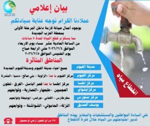 أعلنت شركة مياه الشرب و الصرف الصحي بالفيوم عن تنفيذ أعمال صيانة لازمة داخل محطة مياه العزب الجديدة – المرحلة الأولى مما يستلزم قطع المياه لمدة ٥ ساعات اعتباراً من الساعة الحادية عشر مساء يوم الأربعاء الموافق ٢٠٢٦/٢/٤ و حتى الساعة الرابعة صباح يوم الخميس الموافق ٢٠٢٦/٢/٥.