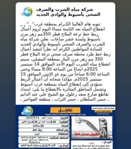 أعلنت شركة مياه الشرب والصرف الصحي بأسيوط والوادي الجديد عن انقطاع مياه الشرب عن بعض مناطق غرب أسيوط، وذلك ابتداءً من الساعة الثامنة مساء اليوم الأحد 14 سبتمبر 2025 وحتى الساعة السادسة من صباح غدٍ الإثنين 15 سبتمبر 2025، بمدة تقديرية تصل إلى عشر ساعات.