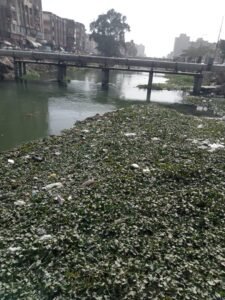 في الوقت الذي تسعى فيه الدولة المصرية جاهدة لتعظيم الاستفادة من كل قطرة مياه، يأتي المشهد للواقع المرير من قلب مركز كفر صقر بمحافظة الشرقية، ليكشف عن مشهد صادم؛ فعدم الاهتمام الجسيم وعدم القيام بالمسؤولية كاملة، حيث غطى ورد النيل والمخلفات البلاستيكية مساحات شاسعة من مجرى “بحر مويس”، فكما توضح الصور، لم تترك النفايات وورد النيل إلا مساحة قليلة ليمر الماء منها، في تجمع ورد النيل والنفايات في صورة تكشف ما وصل إليه الحال بتلك المدينة، والغريب في الأمر أنه في فصيل الصيف تجد أصحاب عربات الكارو، قد نزلوا إلى الاستحمام في هذا المكان بصحبة خيولهم، مما يزيد بلة، أن هذه الخيول تبول في هذه المياه، فضلا على إلقاء القطط الميتة والكلاب.