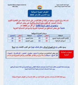 وأضافت الأرصاد أن هناك اضطراب بالملاحة البحرية على بعض المناطق من سواحل ( السلوم – مطروح – العلمين – الإسكندرية – البحيرة . كفر الشيخ – دمياط)، سرعة الرياح من (35) إلى (60 كم/س وارتفاع الأمواج 2 إلى 3 أمتار.