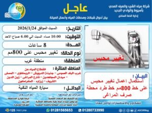 وأوضحت الشركة أن هذه الأعمال ستؤدي إلى انقطاع مؤقت للمياه لمدة 8 ساعات، اعتبارًا من الساعة العاشرة مساء يوم السبت الموافق 24 يناير 2026، وحتى الساعة السادسة صباح يوم الأحد الموافق 25 يناير 2026.