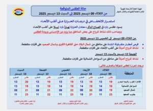 توقعت هيئة الأرصاد الجوية حالة الطقس من الثلاثاء 9 ديسمبر 2025 إلى السبت 13 ديسمبر 2025،