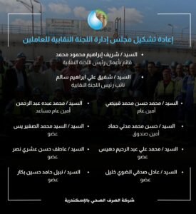 وشمل القرار إعادة تشكيل مجلس إدارة اللجنة النقابية للعاملين بشركة الصرف الصحي بالإسكندرية، حيث ضم التشكيل السيد شريف إبراهيم محمود محمد قائمًا بأعمال رئيس اللجنة النقابية، والسيد شفيق علي إبراهيم سالم نائبًا لرئيس اللجنة النقابية، والسيد محمد حسن محمد قبيصي أمينًا عامًا، والسيد محمد عبده عبد الرحمن أمينًا عامًا مساعدًا، والسيد حسن محمد مدني حماد أمينًا للصندوق.