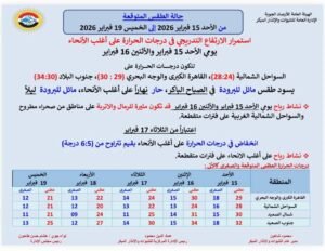 أعلنت هيئة الأرصاد الجوية عحالة الطقس المتوقعة بداية من الأحد 15 فبراير 2026 إلى الخميس 19 فبراير 2026، مؤكدة استمرار الارتفاع التدريجي في درجات الحرارة على أغلب الأنحاء يومي الأحد 15 فبراير والاثنين 16 فبراير.