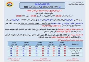 كشفت هيئة الأرصاد الجوية عن حالة الطقس من الثلاثاء 10 فبراير 2026 إلى السبت 14 فبراير 2026، مشيرة إلى استمرار الارتفاع في درجات الحرارة على أغلب الأنحاء.