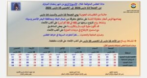 توقعت هيئة الأرصاد الجوية حالة الطقس  خلال الأسبوع الرابع من شهر رمضان المبارك من الجمعة 13 مارس 2026 إلى الخميس 19 مارس 2026.