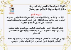 نظرًا لحدوث كسر بخط المياه قطر 600 مم (GRP) المغذي لمدينة الجلود، أعلن جهاز تنمية مدينة العاشر من رمضان عن انخفاض في ضغط المياه بالمنطقة، لحين الانتهاء من أعمال الإصلاح الجارية.