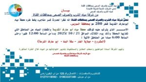 بسبب كسر مفاجئ بخط طرد محطة مياه أبو عارف القديمة قطر 280 مم، أعلنت شركة مياه الشرب والصرف الصحي بمحافظات القناة عن انقطاع مياه الشرب بمحافظة السويس اليوم الثلاثاء 21 أكتوبر 2025.