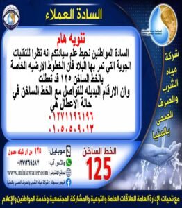أعلنت شركة مياه الشرب والصرف الصحي بالمنيا عن تعطل الخط الساخن (125) مؤقتًا، نتيجة تأثر شبكات الاتصالات بسوء الأحوال الجوية التي تشهدها المحافظة خلال الفترة الحالية.