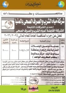 أعلنت شركة مياه الشرب والصرف الصحي بالمنيا، إحدى الشركات التابعة للشركة القابضة لمياه الشرب والصرف الصحي، عن طرح مناقصة عامة ضمن خطتها الاستثمارية للعام المالي 2025/2026، وذلك لتوصيل الوصلات المنزلية بشارع زهران بمنطقة سمالوط البلد – مركز سمالوط، وذلك بنظام المظروف الواحد.