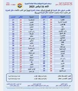 أعلنت الهيئة العامة للأرصاد الجوية خريطة شاملة لدرجات الحرارة المتوقعة يوم الأحد 16 نوفمبر 2025، حيث يسود طقس خريفي مائل للبرودة في الصباح الباكر، معتدل الحرارة نهارًا على أغلب الأنحاء، بينما يميل للبرودة ليلًا على جنوب سيناء وجنوب الصعيد.
