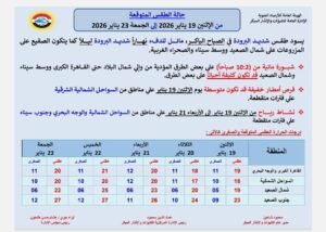 توقعت هيئة الأرصاد الجوية حالة الطقس من الإثنين 19 يناير 2026 إلى الجمعة 23 يناير 2026، مشيرة إلى أنه يسود طقس شديد البرودة في الصباح الباكر، مائل للدفء نهاراً شديد البرودة ليلاً، كما يتكون الصقيع على المزروعات على شمال الصعيد ووسط سيناء والصحراء الغربية.