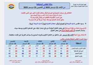 توقعت هيئة الأرصاد الجوية، حالة الطقس من الأحد 21 ديسمبر 2025 إلى الخميس 25 ديسمبر 2025، مشيرة إلى أنه يسود انخفاض في درجات الحرارة في الصباح الباكر وخلال فترات الليل على أغلب الأنحاء حيث تتراوح درجات الحرارة الصغرى على المدن الجديدة بالقاهرة من (8) إلى (9) درجات وعلى شمال الصعيد ووسط سيناء من (5) الى (7) درجات.