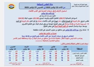 الرئيسيةUncategorizedتوقعات الأرصاد من الأحد حتى الخميس 27 نوفمبر