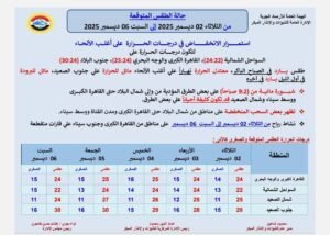 توقعت هيئة الأرصاد حالة الطقس من الثلاثاء 2 ديسمبر 2025 إلى السبت 6 ديسمبر 2025،  مشيرة إلى أن درجات الحرارة تواصل على أغلب الأنحاء لتكون درجات الحرارة على السواحل الشمالية (24:22) ، القاهرة الكبرى والوجه البحري (25:24) ، جنوب البلاد (30:24).