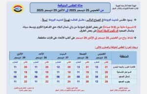 توقعت هيئة الأرصاد حالة الطقس من الخميس 25 ديسمبر 2025 إلى الاثنين 29 ديسمبر 2025، مشيرة إلى أنها يسودها طقس شديد البرودة في الصباح الباكر، مائل للدفء نهاراً شديد البرودة ليلاً .