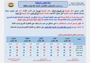 توقعت هيئة الأرصاد الجوية حالة الطقس من السبت 1 نوفمبر 2025 إلى الأربعاء 5 نوفمبر 2025، مشيرة إلى أنه يسود البلاد طقس خريفي مائل للبرودة في الصباح الباكر، مائل للحرارة نهاراً على أغلب الأنحاء، حار على جنوب سيناء وشمال الصعيد شديد الحرارة علي جنوب الصعيد، معتدل الحرارة في أول الليل مائل للبرودة في آخره.