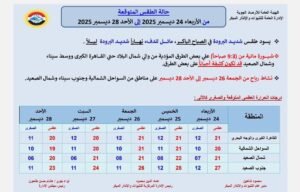 توقعت هيئة الأرصاد حالة الطقس من الأربعاء 24 ديسمبر 2025 إلى الأحد 28 ديسمبر 2025، يسودها طقس شديد البرودة في الصباح الباكر، مائل للدفء نهاراً شديد البرودة ليلاً .