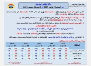 توقعت هيئة الأرصاد الجوية حالة الطقس من السبت 29 نوفمبر 2025 إلى الأربعاء 03 ديسمبر 2025،