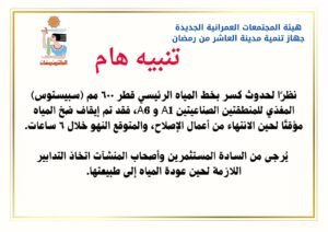 أعلن جهاز تنمية مدينة العاشر من رمضان عن حدوث كسر بخط المياه الرئيسي قطر 600 مم (سيبستوس) المغذي للمنطقتين الصناعيتين A1 وA6، ما استدعى إيقاف ضخ المياه مؤقتًا لحين الانتهاء من أعمال الإصلاح الجارية.