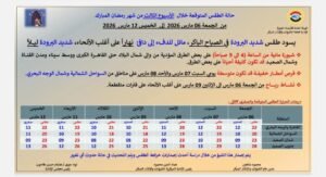 كشفت هيئة الأرصاد الجوية عن حالة الطقس المتوقعة من الجمعة 6 مارس 2026 إلى الخميس 12 مارس 2026،  مشيرة إلى أنه يسود طقس شديد البرودة في الصباح الباكر،  مائل للدفء إلى دافئ نهارًا على أغلب الأنحاء،  شديد البرودة ليلًا.