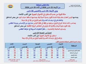 ودعت الهيئة المواطنين إلى متابعة التحديثات المستمرة، واتخاذ التدابير اللازمة، خاصة في ظل سرعة تغير خرائط الطقس خلال هذه الفترة الانتقالية.