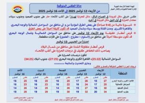 أعلنت الهيئة العامة للأرصاد الجوية عن حالة الطقس المتوقعة خلال الفترة من الأربعاء 12 نوفمبر حتى الأحد 16 نوفمبر 2025، موضحة أن البلاد تشهد طقسًا خريفيًا مائلًا للبرودة في الصباح الباكر، مائلًا للحرارة نهارًا على أغلب الأنحاء، ويكون حارًا على جنوب الصعيد وجنوب سيناء، فيما يصبح معتدل الحرارة ليلًا مائلًا للبرودة في آخره.