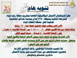 وناشد جهاز مدينة حدائق العاصمة، المواطنين، بضرورة اتخاذ التدابير اللازمة لتخزين احتياجاتهم من مياه الشرب قبل بداية الأعمال، مؤكدًا أنه سيتم إعادة ضخ المياه فور الانتهاء من تنفيذها، ومقدمًا الشكر لتفهمهم وتعاونهم.