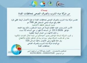 أعلنت شركة مياه الشرب والصرف الصحي بمحافظات القناة أنه نظرًا لأعمال ربط خط طرد محطة رفع صرف صحي المستقبل بقطر 700 مم بمدينة المستقبل بمحافظة الإسماعيلية، سيتم انقطاع المياه عن مدينة المستقبل، وذلك اليوم الجمعة اعتبارًا من الساعة 2 ظهرًا وحتى الساعة 12 مساءً، للانتهاء من أعمال الربط المطلوبة.