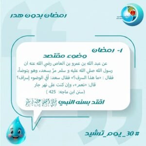 عن عبد الله بن عمرو بن العاص رضي الله عنه أن رسول الله صلى الله عليه وسلم مر بسعد وهو يتوضأ، فقال: «ما هذا السرف؟» فقال سعد: أفي الوضوء إسراف؟ قال: «نعم، وإن كنت على نهر جار».. سنن ابن ماجه 425.