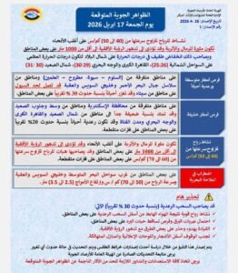 كشفت هيئة الأرصاد الجوية عن حالة الطقس المتوقعة اليوم الجمعة، مشيرة إلى وجود نشاط للرياح تتراوح سرعتها من (40 إلى 50) كم/س على أغلب الأنحاء.