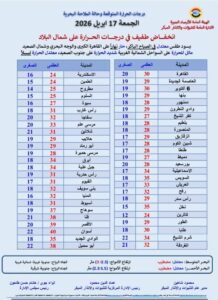 وأعلنت الهيئة درجات الحرارة العظمى كالتالي: