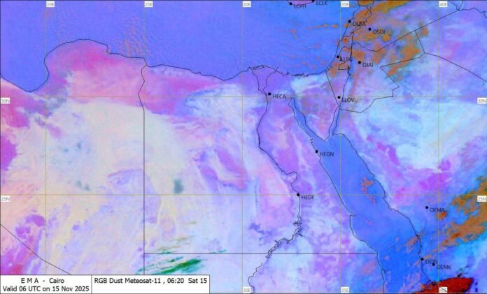 وتظهر بعض السحب المنخفضة على مناطق من القاهرة الكبرى ومدن القناة ووسط سيناء وقد ينتج عنها سقوط رذاذ خفيف وغير مؤثر على بعض المناطق.