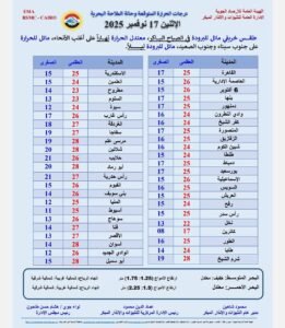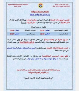 وأوضحت الهيئة أن هناك فرصا ضعيفة لأمطار خفيفة على مناطق من السواحل الشمالية وشمال الوجه البحري على فترات متقطعة.