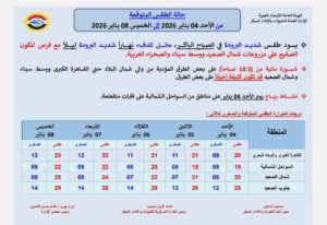 وأردفت الهيئة في بيانها أنه سيكون هناك نشاط للرياح يوم الأحد 4 يناير على مناطق من السواحل الشمالية على فترات متقطعة.