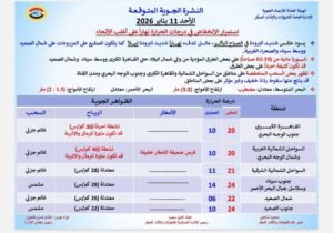 أكدت هيئة الأرصاد الجوية استمرار الانخفاض في درجات الحرارة نهاراً على أغلب الأنحاء غدا، حيث يسود طقس شديد البرودة في الصباح الباكر، مائل للدفء نهاراً شديد البرودة ليلاً كما يتكون الصقيع على المزروعات على شمال الصعيد ووسط سيناء والصحراء الغربية.