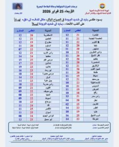 أكدت هيئة الأرصاد الجوية أنه يسود البلاد طقس بارد إلى شديد البرودة في الصباح الباكر ، مائل للدفء إلى دافئ نهاراً على أغلب الأنحاء، بارد إلى شديد البرودة ليلاً.