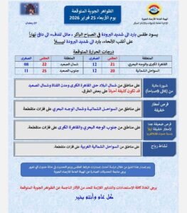 أكدت هيئة الأرصاد الجوية أنه يسود البلاد طقس بارد إلى شديد البرودة في الصباح الباكر ، مائل للدفء إلى دافئ نهاراً على أغلب الأنحاء، بارد إلى شديد البرودة ليلاً.
