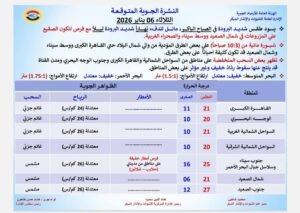 أكدت هيئة الأرصاد الجوية أنه يسود البلاد غدًا طقس شديد البرودة في الصباح الباكر، مائل للدفء نهاراً شديد البرودة ليلاً مع فرص تكون صقيع علي المزروعات في شمال الصعيد ووسط سيناء والصحراء الغربية.