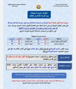 بينما يسود طقس شديد البرودة في الصباح الباكر، مائل للدفء نهاراً على أغلب الأنحاء دافئ على جنوب الصعيد، شديد البرودة ليلاً.
