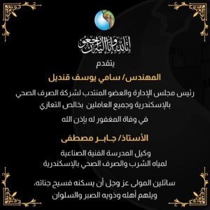 تقدم المهندس سامي قنديل، رئيس شركة الصرف الصحي بالإسكندرية، وجميع العاملين بالشركة، بخالص التعازي في وفاة المغفور له بإذن الله الأستاذ جابر مصطفى، وكيل المدرسة الفنية الصناعية لمياه الشرب والصرف الصحي بالإسكندرية.