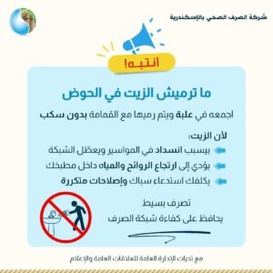 أطلقت شركة الصرف الصحي بالإسكندرية حملة توعية جديدة تحت شعار “انتبه!”، تحذر فيها المواطنين من العواقب الوخيمة لرمي زيت الطعام المستعمل في أحواض المطابخ وشبكة الصرف الصحي.