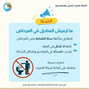 أصدرت شركة الصرف الصحي بالإسكندرية تحذيراً مهماً للمواطنين بضرورة عدم إلقاء المناديل الورقية في المراحيض.