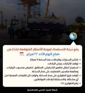أعلنت شركة الصرف الصحي بالإسكندرية رفع درجة الاستعداد القصوى اعتبارًا من صباح اليوم الأحد 22 فبراير، استعدادًا لموجة الأمطار المتوقعة، واتخاذ حزمة من الإجراءات الاحترازية لضمان انتظام العمل وعدم تأثر الخدمات.