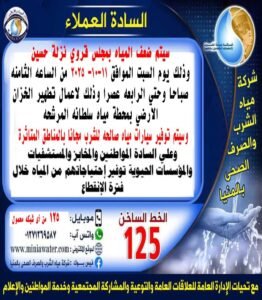 أعلنت شركة مياه الشرب والصرف الصحي بالمنيا ضعف المياه بمجلس قروي نزلة حسين التابع للمحافظة، وذلك يوم السبت الموافق 11 أكتوبر 2025 من الساعة الثامنة صباحًا وحتى الرابعة عصرًا، نظرًا لتنفيذ أعمال تطهير الخزان الأرضي بمحطة مياه سلطانة المرشحة.