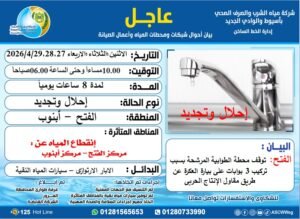 وأكدت الشركة أنها اتخذت حزمة من الإجراءات لتقليل تأثير تلك الأعمال على المواطنين، من بينها تشغيل المحطات الارتوازية البديلة، وتوفير سيارات مياه نقية بالمناطق المتأثرة عند الطلب.