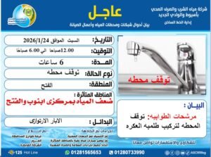 وأوضحت الشركة أن الأعمال ستستغرق نحو 6 ساعات، تبدأ من صباح يوم السبت الموافق 24 يناير 2026م وحتى الساعة السادسة صباحًا من نفس اليوم، مما يستلزم التوقف المؤقت لمحطة مرشحات الطوابية خلال فترة التنفيذ.