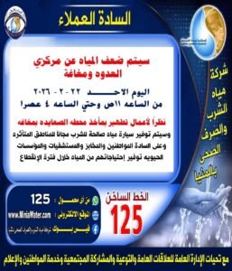 وأكدت أنه سيتم توفير سيارات مياه صالحة للشرب مجانًا للمناطق المتأثرة، ويمكن طلبها من خلال الاتصال بالخط الساخن 125 من أي تليفون أرضي أو محمول، مشددة على المواطنين وأصحاب المخابز والمستشفيات وكافة المنشآت الحيوية تدبير احتياجاتهم من المياه خلال فترة الأعمال.