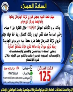 أعلنت شركة مياه الشرب والصرف الصحي بالمنيا عن ضعف مياه الشرب بقرى مجلس قروي نزلة البدرمان ودهروط وتوابعها بمركز ديرمواس، وذلك اعتبارًا من الساعة السابعة صباح يوم الثلاثاء الموافق 16 سبتمبر 2025 وحتى الساعة السادسة مساءً من نفس اليوم.