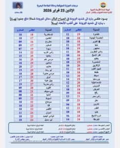 كما تنشط الرياح على أغلب الأنحاء، ما يزيد الإحساس ببرودة الطقس، وقد تثير الرمال والأتربة في جنوب البلاد ومناطق البحر الأحمر والصحراء الغربية، مسببة انخفاضًا في مستوى الرؤية الأفقية، إضافة إلى اضطراب الملاحة البحرية وارتفاع الأمواج،